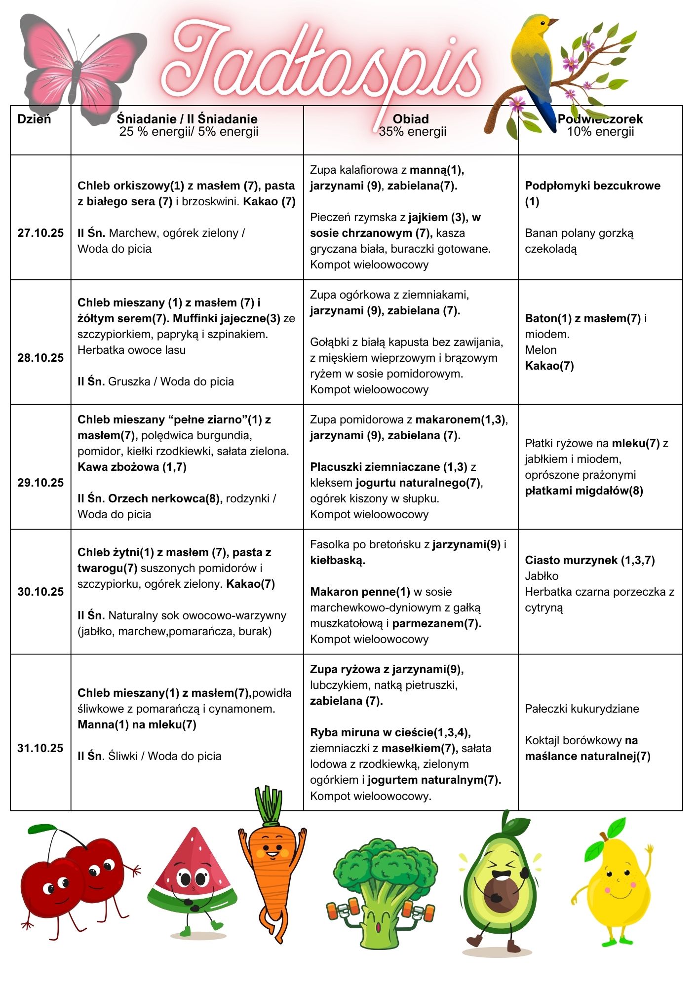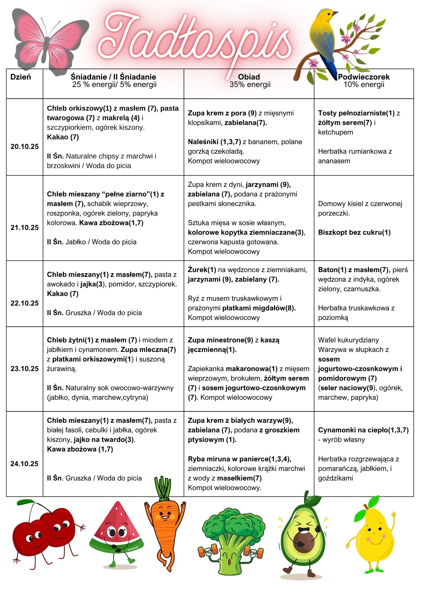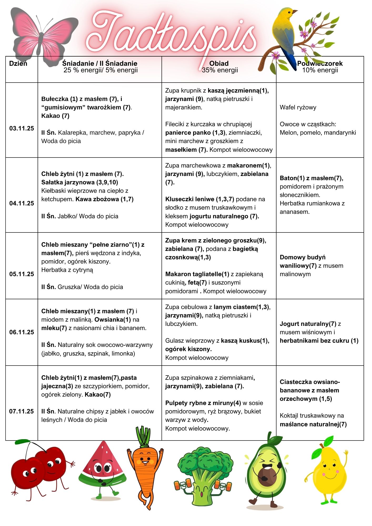 W powyższym jadłospisie wyróżnione są numerami substancje i produkty powodujące alergie lub nietolerancję, zgodnie z zarządzeniem UE nr 1169/2011 załącznik nr 2 z dnia 25 października 2011 w sprawie przekazywania konsumentom informacji na temat żywności. Do sporządzania posiłków używane są następujące przyprawy: lubczyk, majeranek, kminek, liść laurowy, ziele angielskie, bazylia,oregano, zioła prowansalskie, papryka mielona, pieprz, pieprz ziołowy, cynamon, imbir, gałka muszkatołowa, curry, kurkuma, sól o obniżonej zawartości sodu. Zgodnie z informacjami producentów użyte produkty gotowe np.: kakao, herbata, koncentrat pomidorowy, produkty mięsne mogą zawierać śladowe ilości alergenów: glutenu, laktozy, soi, orzechów, selera i gorczycy.