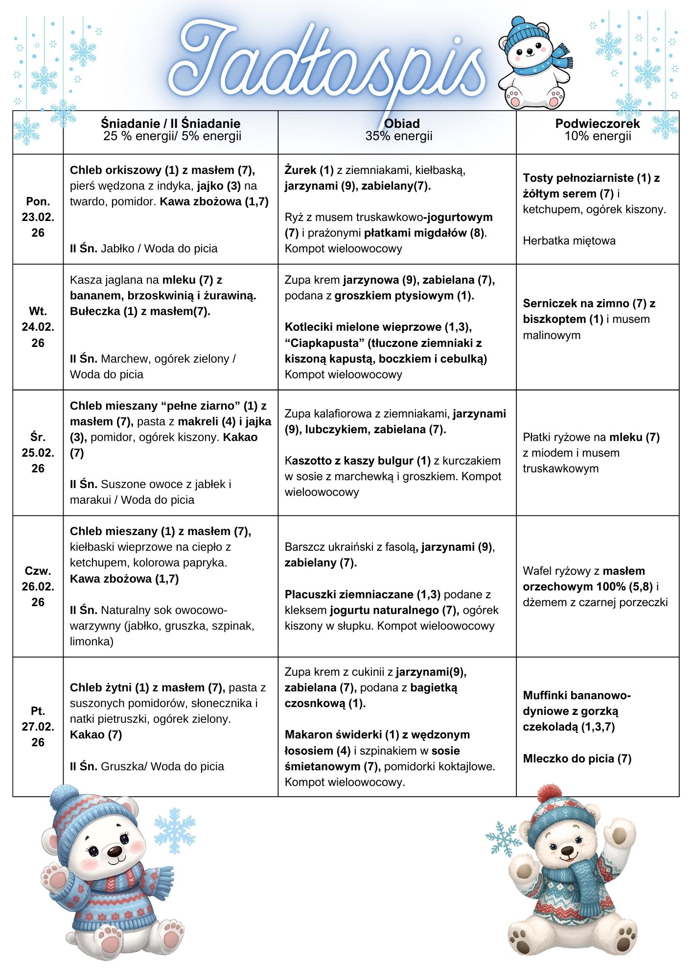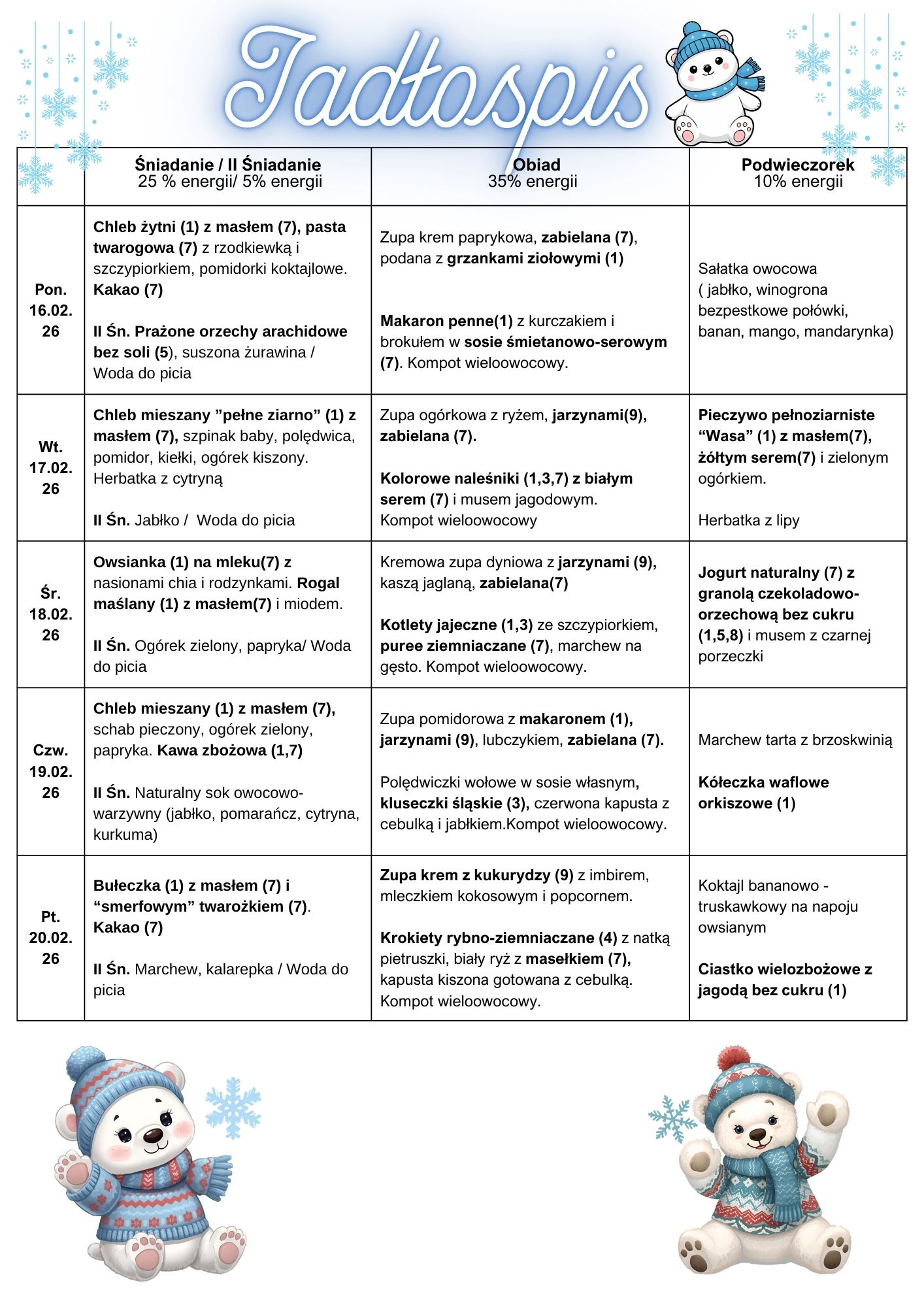W powyższym jadłospisie wyróżnione są numerami substancje i produkty powodujące alergie lub nietolerancję, zgodnie z zarządzeniem UE nr 1169/2011 załącznik nr 2 z dnia 25 października 2011 w sprawie przekazywania konsumentom informacji na temat żywności. Do sporządzania posiłków używane są następujące przyprawy: lubczyk, majeranek, kminek, liść laurowy, ziele angielskie, bazylia,oregano, zioła prowansalskie, papryka mielona, pieprz, pieprz ziołowy, cynamon, imbir, gałka muszkatołowa, curry, kurkuma, sól o obniżonej zawartości sodu. Zgodnie z informacjami producentów użyte produkty gotowe np.: kakao, herbata, koncentrat pomidorowy, produkty mięsne mogą zawierać śladowe ilości alergenów: glutenu, laktozy, soi, orzechów, selera i gorczycy.